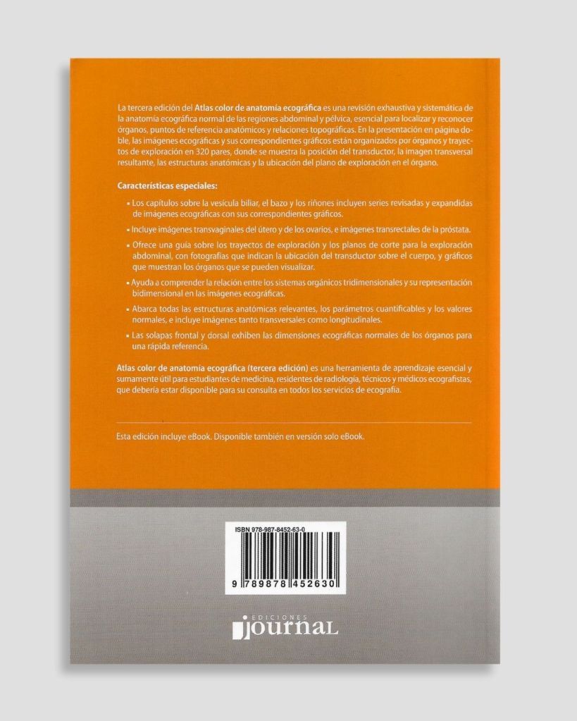 Atlas color de anatomía ecográfica (tercera edición) es una herramienta de aprendizaje esencial y sumamente útil para estudiantes de medicina, residentes de radiología, técnicos ecografistas y médicos ecografistas, que debería estar disponible para su consulta en los servicios de ecografía.