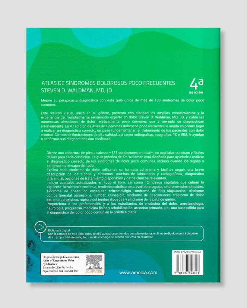 El doctor Steven D. Waldman es ya un reconocido especialista norteamericano que se ha especializado en el tratamiento intervencionista del dolor, y esta, la cuarta edición de Atlas de síndromes dolorosos poco frecuentes, busca aclarar todo lo concerniente a los “raros” dolores que pueden sufrir los pacientes en toda su anatomía. A lo largo de 12 secciones, 135 capítulos, más de 500 imágenes y fotografías y alrededor de200excelentes ilustraciones, el doctor Waldman hace una revisión de dolores de cabeza, cuello y plexobraquial, mano y muñeca, tórax, abdomen, área inguinal, dolor lumbar, dolor pélvico, cadera, extremidades inferiores, rodilla y pie. En cada uno de los capítulos se pueden encontrar el síndrome clínico, los signos y síntomas, las pruebas que se deben hacer, el diagnóstico diferencial, el tratamiento a aplicar y las posibles complicaciones. Esta obra, ya una referencia entre los especialistas, es de particular interés para los anestesiólogos y para todo profesional que desee tratar el dolor a veces difícil de diagnosticar de los pacientes.