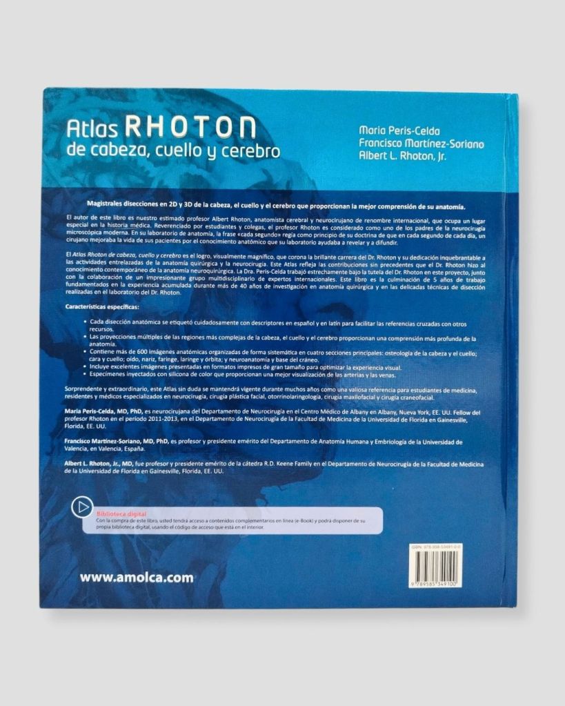 En memoria del doctor Albert Rhoton y al proyecto que inició pero que no vio culminado, los doctores Maria Peris-Celda, neurocirujana del Centro Médico de Albany en los Estados Unidos, y Francisco Martínez Soriano, profesor emérito de anatomía de la Universidad de Valencia en España, terminaron de compilar más de 600 imágenes de alta calidad, en las cuales se muestra de manera muy detallada la anatomía de la cabeza, el cuello y el cerebro humanos. Conscientes de cuán importante es para los cirujanos el conocimiento y la comprensión pormenorizados de la anatomía humana, los autores de esta obra ofrecen a los lectores un atlas completo de las disecciones de esta área del cuerpo humano, sin dejar de lado ninguna capa o estructura anatómica, para que los médicos practicantes que adquieran esta obra revisen cuáles son las áreas seguras durante procedimientos quirúrgicos de la cabeza y el cuello y logren la precisión requerida para ayudar a sus pacientes. A lo largo de sus 28 capítulos, la obra expone en imágenes de disecciones superficiales y profundas la anatomía de la bóveda craneal adulta y fetal, las vértebras cervicales y el sistema esquelético del cráneo, las ramificaciones vasculares y de los nervios en la cara y los músculos faciales. Asimismo, se muestran cortes y disecciones de la nariz, el oído externo, medio e interno, la faringe, la laringe y el globo ocular. Del mismo modo, una sección del libro está dedicada a la anatomía del cerebro (incluidas sus ramificaciones vasculares), el cerebelo y el tronco encefálico. Esta obra condensa años de trabajo para que estudiantes de Medicina, pero también especialistas en neurocirugía, neurología, otorrinolaringología, cirugía maxilofacial, cirugía plástica y oftalmología puedan estudiar y revisar la nomenclatura en español y en latín de la anatomía de la cabeza, el cuello y el cerebro.