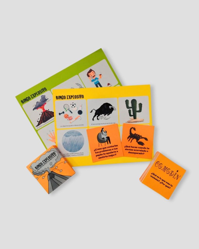 El Bingo Explosivo está diseñado para abordar y tratar la agresividad, los sentimientos de rabia y los comportamientos agresivos de los niños. A través del juego se abre el diálogo sobre sentimientos que impulsan a actuar de manera agresiva, aprender a identificar y normalizar estos sentimientos así como a manejarlos y expresarlos de manera adecuada. La dinámica del juego facilita la comunicación y apertura del niño, que de otra forma, es difícil de obtener.