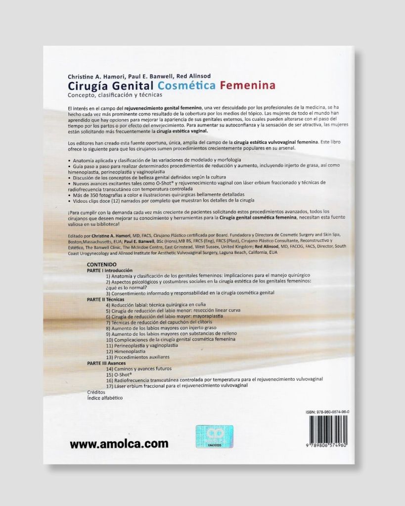 «Anatomía aplicada y clasificación de las variaciones de modelado y morfología Guía paso a paso para realizar determinados procedimientos de reducción y aumento, incluyendo injerto de grasa, así como himenoplastia, perineoplastia y vaginoplastia. Discusión de los conceptos de belleza genital definidos según la cultura Nuevos avances excitantes tales como O-Shot® y rejuvenecimiento vaginal con láser erbium fraccionado y técnicas de radiofrecuencia transcutánea con temperatura controlada. Más de 350 fotografías a color e ilustraciones quirúrgicas bellamente detalladas Videos clips doce (12) narrados por completo que muestran los detalles de la cirugía»