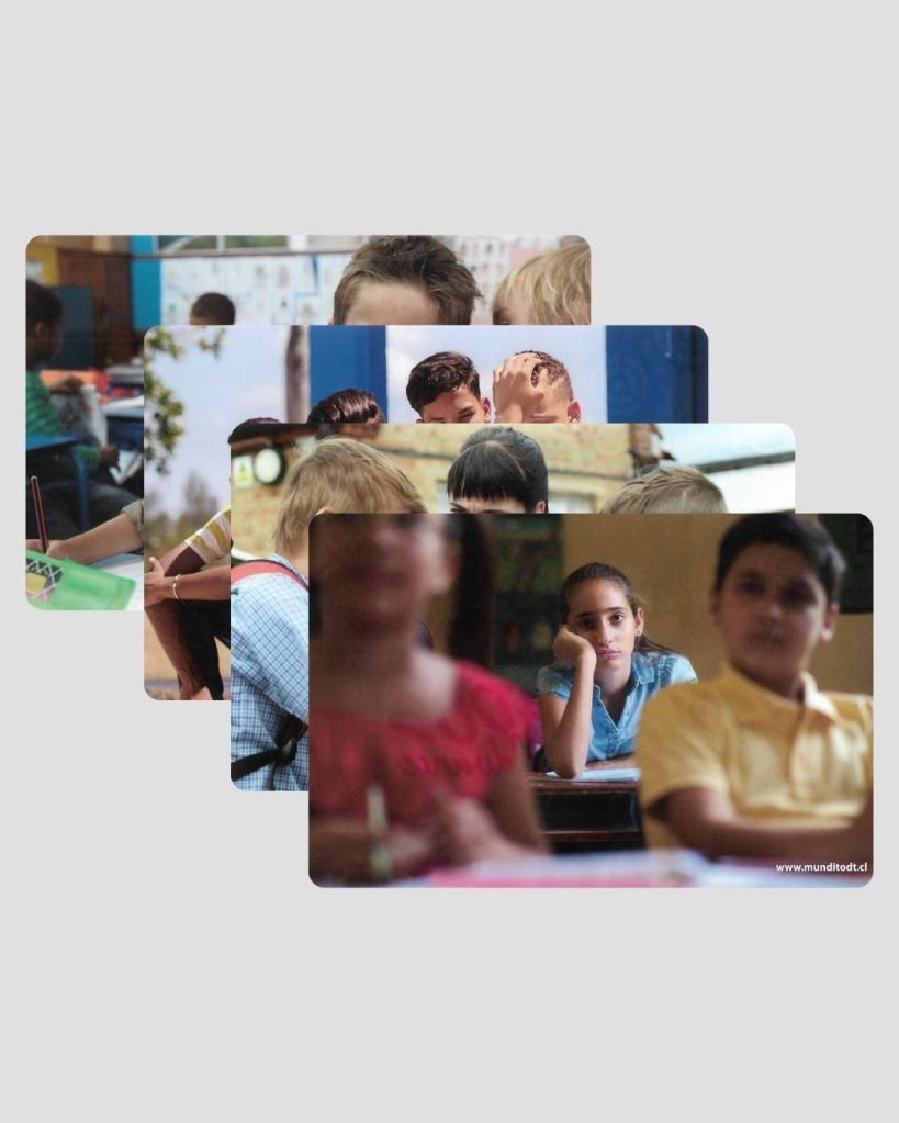 Este material contiene 44 cartas con escenas de interacciones sociales reales, a través de las cuales se busca fomentar que el niño aprenda a comprender lo que está sucediendo en cada escena, ayudándole a identificar emociones e interpretar lo que cada uno de los personajes está haciendo y sintiendo. De esta manera, los niños podrán practicar las habilidades sociales y de empatía, y a su vez mejorar su manera de actuar en las situaciones sociales. Bilingüe.