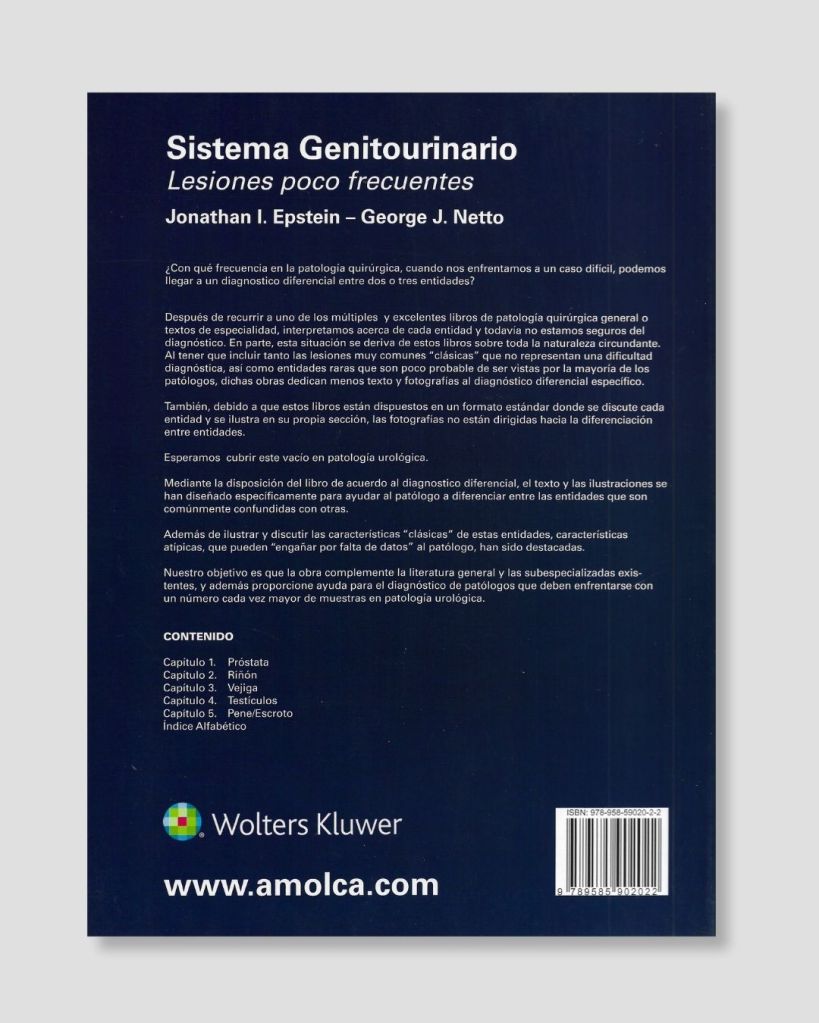 «¿Con qué frecuencia en la patología quirúrgica, cuando nos enfrentamos a un caso difícil, podemos llegar a un diagnostico diferencial entre dos o tres entidades? Después de recurrir a uno de los múltiples y excelentes libros de patología quirúrgica general o textos de especialidad, interpretamos acerca de cada entidad y todavía no estamos seguros del diagnóstico. En parte, esta situación se deriva de estos libros sobre toda la naturaleza circundante. Al tener que incluir tanto las lesiones muy comunes “clásicas” que no representan una dificultad diagnóstica, así como entidades raras que son poco probable de ser vistas por la mayoría de los patólogos, dichas obras dedican menos texto y fotografías al diagnóstico diferencial específico. También, debido a que estos libros están dispuestos en un formato estándar donde se discute cada entidad y se ilustra en su propia sección, las fotografías no están dirigidas hacia la diferenciación entre entidades. Esperamos cubrir este vacío en patología urológica. Mediante la disposición del libro de acuerdo al diagnostico diferencial, el texto y las ilustraciones se han diseñado específicamente para ayudar al patólogo a diferenciar entre las entidades que son comúnmente confundidas con otras. Además de ilustrar y discutir las características “clásicas” de estas entidades, características atípicas, que pueden “engañar por falta de datos” al patólogo, han sido destacadas. Nuestro objetivo es que la obra complemente la literatura general y las subespecializadas existentes, y además proporcione ayuda para el diagnóstico de patólogos que deben enfrentarse con un número cada vez mayor de muestras en patología urológica.»