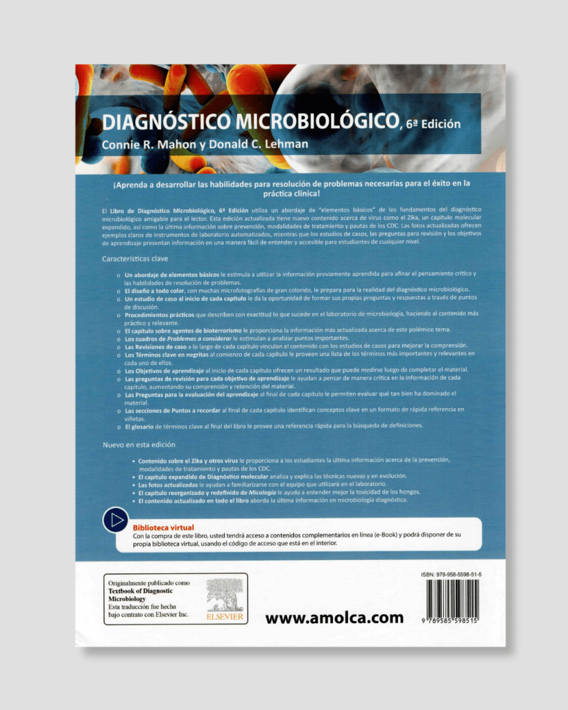 El Libro de Diagnóstico Microbiológico, 6ª Edición utiliza un abordaje de “elementos básicos” de los fundamentos del diagnóstico microbiológico amigable para el lector. Esta edición actualizada tiene nuevo contenido acerca de virus como el Zika, un capítulo molecular expandido, así como la última información sobre prevención, modalidades de tratamiento y pautas de los CDC. Las fotos actualizadas ofrecen ejemplos claros de instrumentos de laboratorio automatizados, mientras que los estudios de casos, las preguntas para revisión y los objetivos de aprendizaje presentan información en una manera fácil de entender y accesible para estudiantes de cualquier nivel. Características clave ° Un abordaje de elementos básicos le estimula a utilizar la información previamente aprendida para afinar el pensamiento crítico y las habilidades de resolución de problemas. ° El diseño a todo color, con muchas microfotografías de gran colorido, le prepara para la realidad del diagnóstico microbiológico. ° Un estudio de caso al inicio de cada capítulo le da la oportunidad de formar sus propias preguntas y respuestas a través de puntos de discusión. ° Procedimientos prácticos que describen con exactitud lo que sucede en el laboratorio de microbiología, haciendo al contenido más práctico y relevante. ° El capítulo sobre agentes de bioterrorismo le proporciona la información más actualizada acerca de este polémico tema. ° Los cuadros de Problemas a considerar le estimulan a analizar puntos importantes. ° Las Revisiones de caso a lo largo de cada capítulo vinculan el contenido con los estudios de casos para mejorar la comprensión. ° Los Términos clave en negritas al comienzo de cada capítulo le proveen una lista de los términos más importantes y relevantes en cada uno de ellos. ° Los Objetivos de aprendizaje al inicio de cada capítulo ofrecen un resultado que puede medirse luego de completar el material. ° Las preguntas de revisión para cada objetivo de aprendizaje le ayudan a pensar de manera crítica en la información de cada capítulo, aumentando su comprensión y retención del material. ° Las Preguntas para la evaluación del aprendizaje al final de cada capítulo le permiten evaluar qué tan bien ha dominado el material. ° Las secciones de Puntos a recordar al final de cada capítulo identifican conceptos clave en un formato de rápida referencia en viñetas. ° Un manual de laboratorio editable e imprimible le proporciona oportunidades adicionales para aprender el contenido del curso a través de escenarios de la vida real con preguntas para reforzar los conceptos. ° El glosario de términos clave al final del libro le provee una referencia rápida para la búsqueda de definiciones.