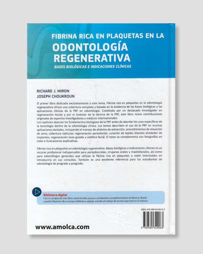 Editado por Richard Miron, investigador prolífico en el tema de la fibrina rica en plaquetas, y por Joseph Choukroun, creador de la fibrina rica en plaquetas, el libro Fibrina rica en plaquetas en la odontología regenerativa cubre un espacio en el campo de la medicina oral regenerativa al compilar los trabajos de investigación de 17 autores de 10 países sobre este tratamiento con veinte años en el campo odontológico. Esta obra cuenta con más de 300 imágenes de alta resolución y está presentado desde una perspectiva académica para explicar los conceptos biológicos de la fibrina rica en plaquetas, las propiedades en la regeneración tisular con base en la evidencia científica y clínica, así como recientes investigaciones sobre el tema con estudios clínicos que utilizaron métodos aleatorizados conducidos con protocolos y controles apropiados. A lo largo de los 15 capítulos que constituyen la obra, se abordan los diferentes usos clínicos de la fibrina rica en plaquetas en el campo odontológico: la cicatrización de alvéolo posextractivo, la regeneración de tejidos blandos, el uso de la fibrina rica en plaquetas en procedimientos de elevación sinusal, para la regeneración periodontal, en procedimientos de reparación de membrana de Schneider, el tratamiento de retracciones gingivales y como adyuvante en la odontología implantar. Sin embargo, las fronteras de este libro son mucho más extensas, pues el lector también podrá encontrar capítulos relacionados con la aplicación de la fibrina rica en plaquetas en procedimientos de otras áreas de la medicina: la medicina ortopédica, la regeneración facial y de tejidos blandos, la regeneración de úlceras.