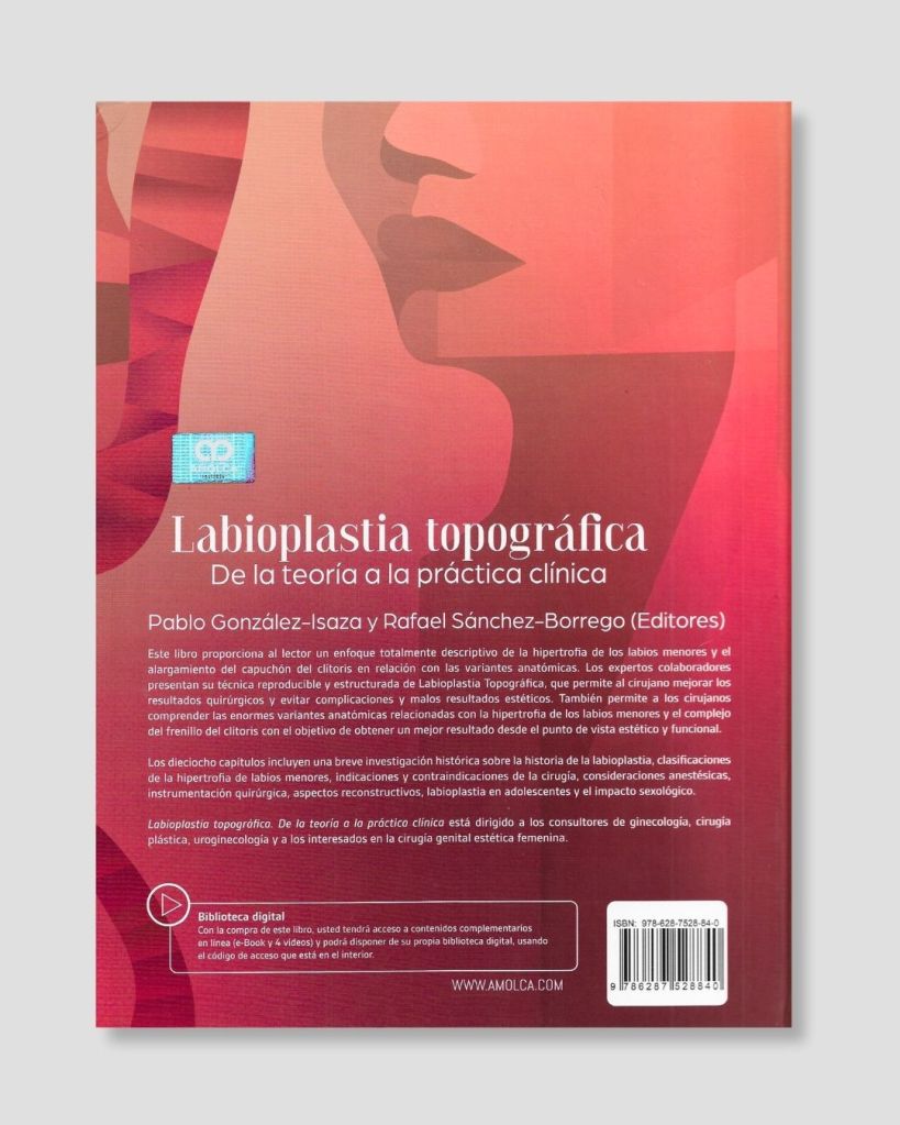 Este libro, titulado «Labioplastia Topográfica: De la teoría a la práctica clínica,» es una obra significativa en el campo de la ginecología estética, escrita por el Dr. Pablo González-Isaza en colaboración con destacados profesionales. El prólogo, a cargo de Ezequiel López Peralta, destaca la evolución de la ginecología estética desde sus inicios y el papel fundamental de la ciencia en contraposición a las ideologías. Se enfatiza el derecho de las mujeres a tomar decisiones sobre su cuerpo, respaldado por investigaciones, congresos y sociedades científicas internacionales. El contenido del libro abarca desde aspectos históricos hasta consideraciones ético-jurídicas relacionadas con la labioplastia. Comienza con una introducción del autor, Pablo González-Isaza, seguida por capítulos dedicados a la anatomía topográfica, clasificación de la hipertrofia de los labios menores y técnicas quirúrgicas de labioplastia. Se exploran aspectos clave como indicaciones/contraindicaciones, consideraciones anestésicas, instrumentación quirúrgica y el papel de las fuentes de energía en la labioplastia. El libro también aborda temas especializados como complicaciones y su prevención, labiaminoraplastia secundaria, labioplastia en adolescentes y las implicaciones psicológicas y sexuales después de la intervención. Además, se incluyen capítulos sobre labioplastia de labios mayores con ácido hialurónico y clitoropexia-clitoroplastia, proporcionando una visión integral de la ginecología estética. El enfoque ético y legal se aborda en el capítulo dedicado a aspectos ético-jurídicos. El libro concluye con anexos que complementan la información presentada y un índice para facilitar la referencia. En resumen, «Labioplastia Topográfica» emerge como una obra completa y bien fundamentada que aborda lalabioplastia desde diversas perspectivas, combinando teoría y práctica clínica. Su contenido diverso y actualizado lo posiciona como una contribución valiosa a la literatura en el campo de la ginecología estética, con el potencial de ser una referencia indispensable para profesionales y académicos interesados en este tema.